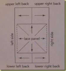 Først strikkes den øvre ryg fra midten og ud, så den nedre på samme måde. Tilsidst samles det hele med 1/4 af mønsterdelen.